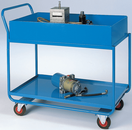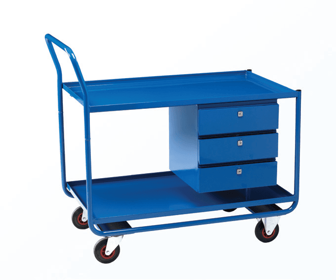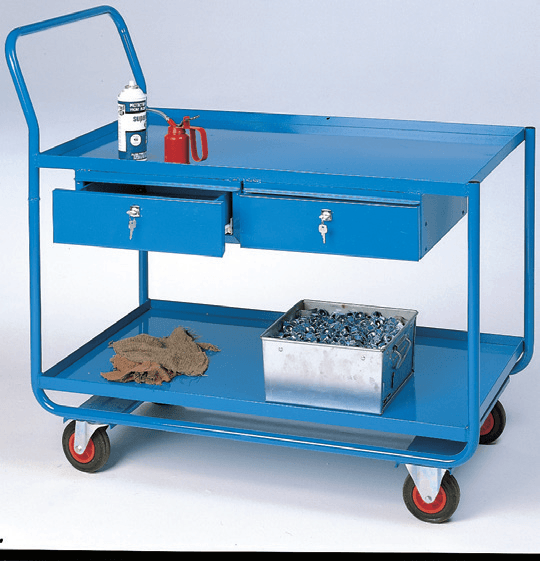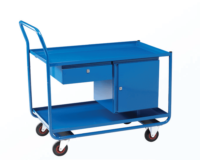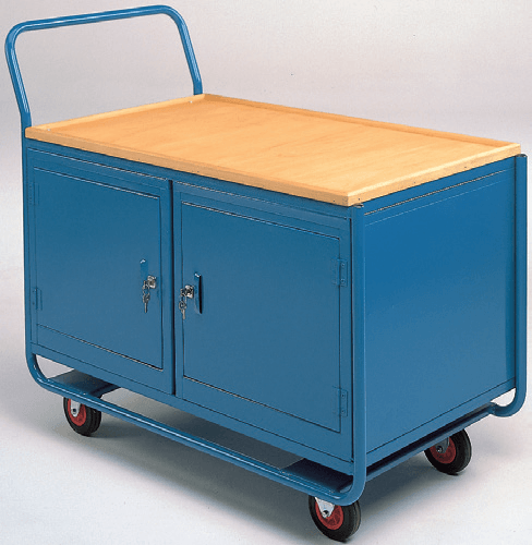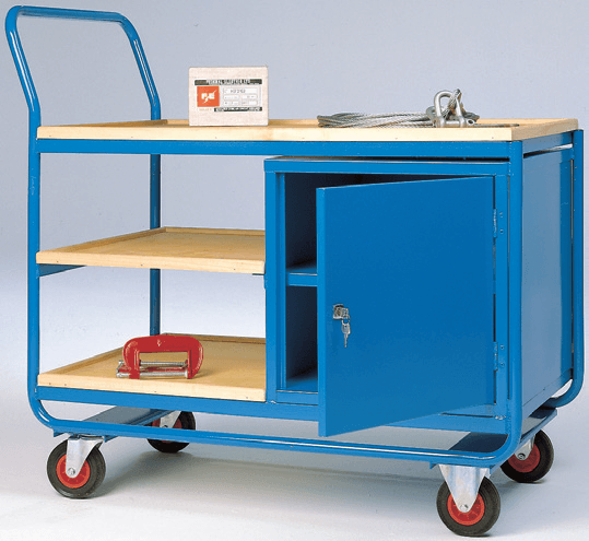 Welded tubular and flat steel chassis frame. All plywood shelves are fixed, polyurethane coated with hardwood edge and have 20mm upstand. Steel shelves have 25mm upstand. All steelwork is finished in blue epoxy. Cupboards and drawers supplied with lock and 2 keys.