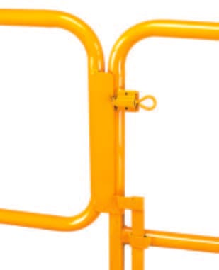 Fully welded with a raised expanded metal floor, located and welded into a formed kickboard surround. Tubular handrail and rear RSA frame with wire mesh panels. Hinged entry gate with spring return to closed position a spring loaded retention bolt holds the gate in the closed position.