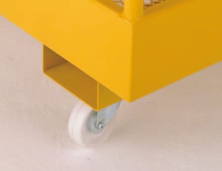 Castors (Factory Fitted)- 2 swivel, 2 fixed castors, 100mm diameter. nylon wheels. Provides for ease of movement and storage independent of forklift truck. Increases height by 125mm