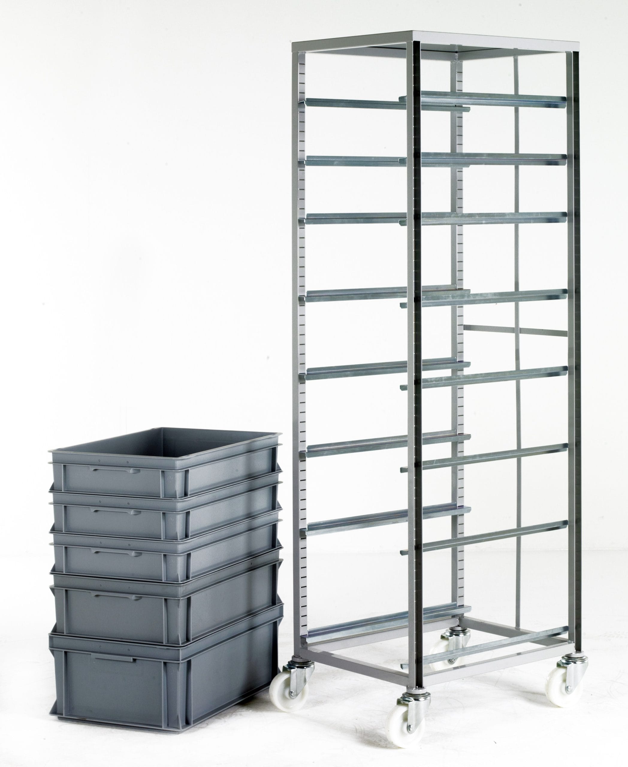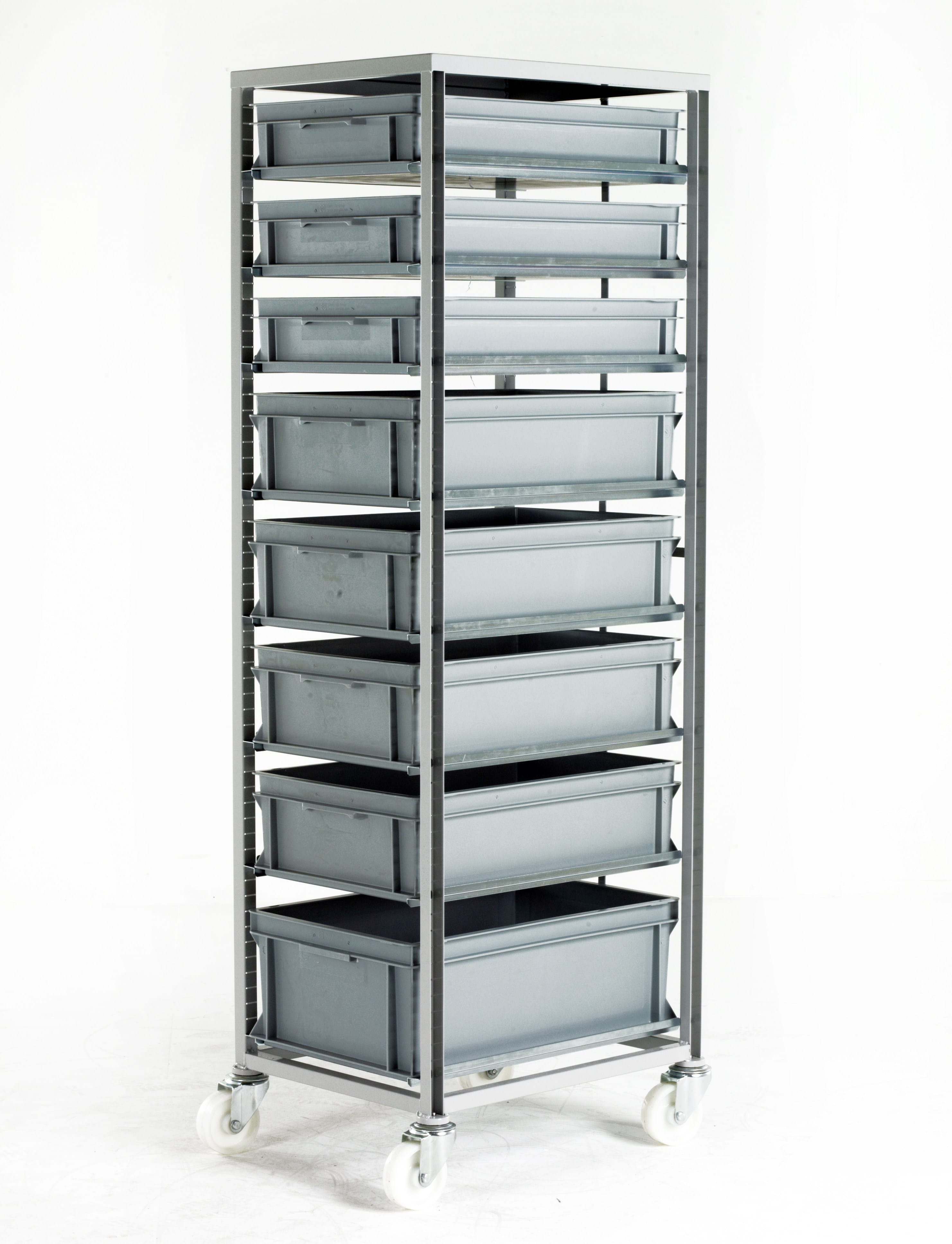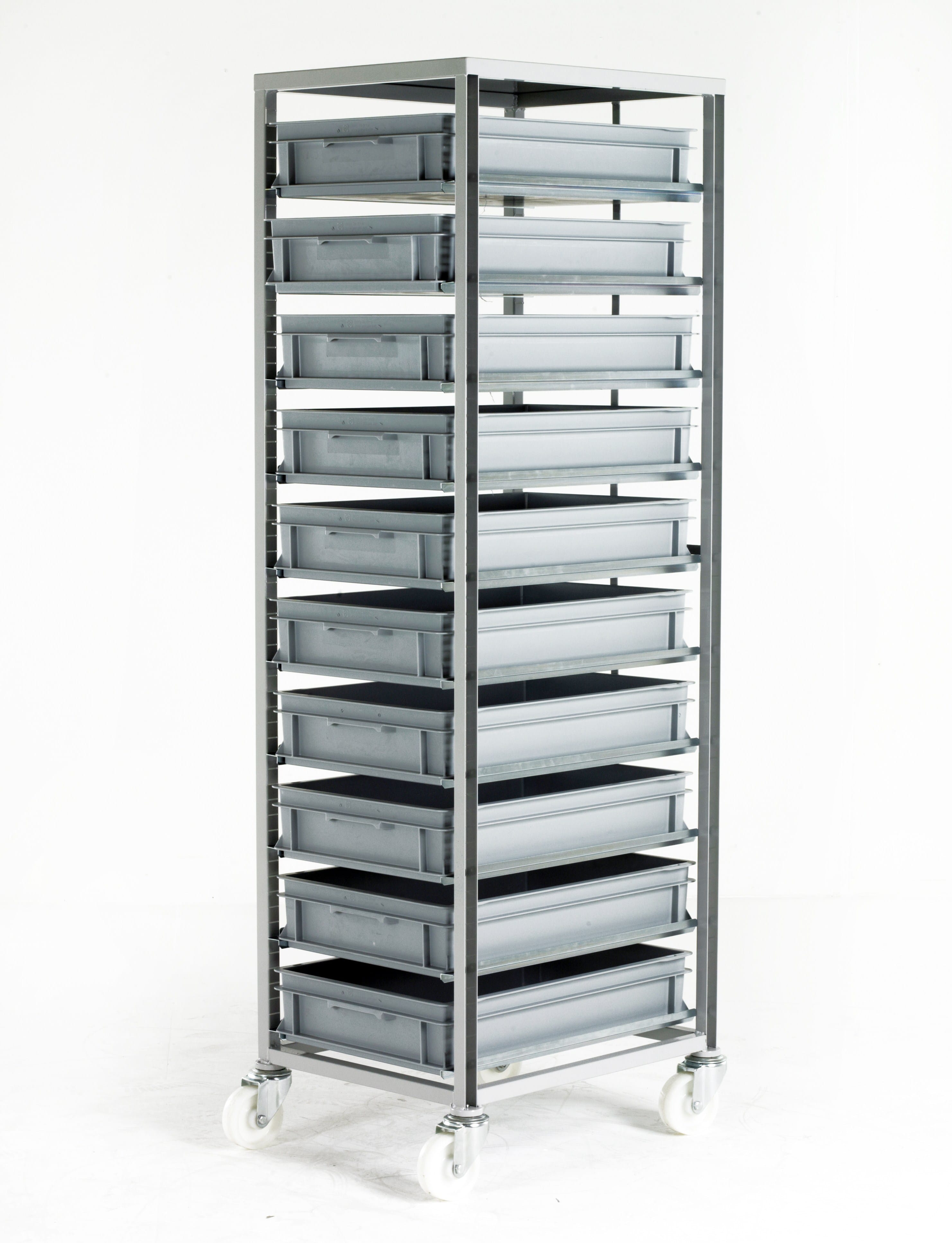 and where to position it – multiple combinations – supplied complete with 10 x pairs of tray runners. Metal strap prevents trays from being pushed through when loading. Wheels: 4 swivel castors with 100mm diameter nylon wheels and roller bearings Finish: Light grey epoxy. Weight: 25kgs empty.