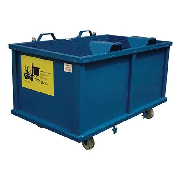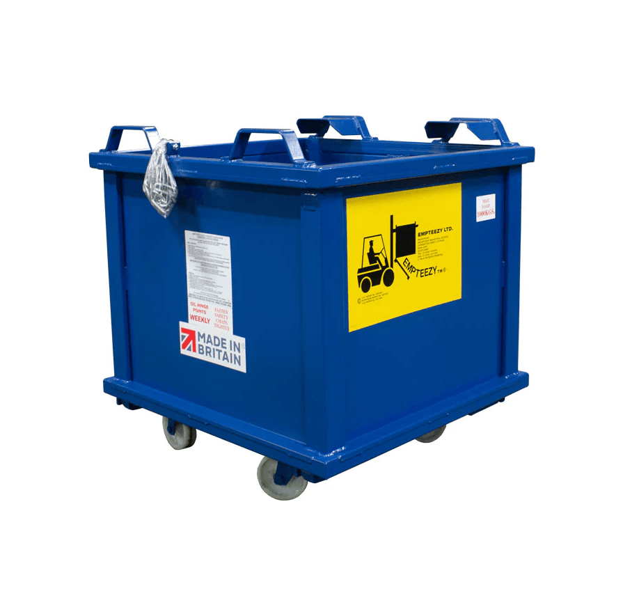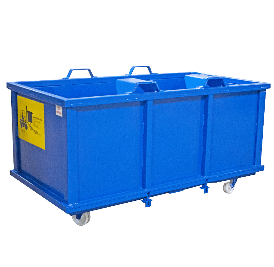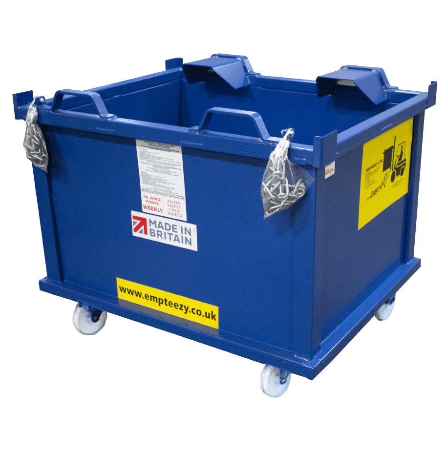 Auto dumping containers are practical and safe as auto-tipping skips for collecting and disposing of waste. Auto dumping containers fit most standard forklift trucks without any modification and are fully automatic. When we say fully automatic, we mean that they have no wires, no pulleys and don’t require climbing the mast to initiate the disposal. This in turn saves time and the driver’s safety by avoiding taking unnecessary risks. They come with 2 fixed, 2 swivel nylon castors and a safety securing chain. Each container is manufactured with steel plate sides and a steel plate base.