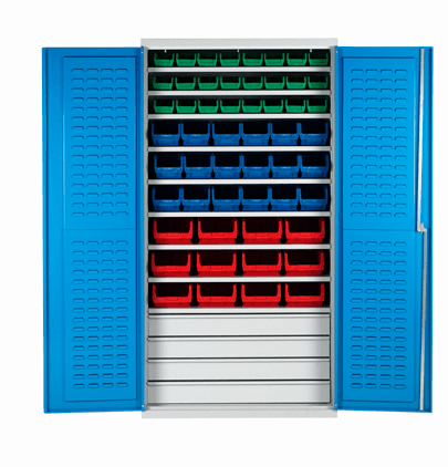 54 bin unit Cupboard with 9 shelves, 24 x No.2 bins, 18 x No.3 bins, 12 x No. 4 bins and 4 drawer unit. Ref: BCS60