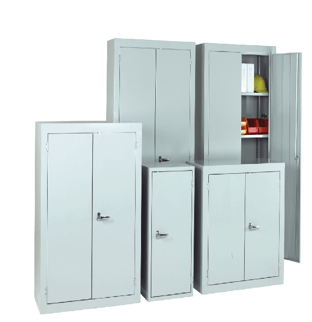 Range of steel cabinets constructed to imperial sizes, designed to combine with existing imperial size cabinets. Lever lock handles with 2 rods locking top and bottom, 2 keys. Powder coated finish in grey as standard, blue doors on request. Shelf capacity 50kgs, maximum 250kgs per cabinet.
