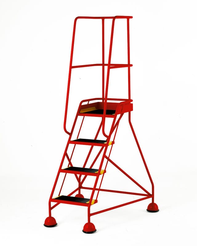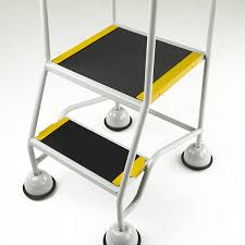 Fitted with dome covered spring loaded swivel castors which retract when weight is applied to the steps, giving firm contact with the floor. Dome covers have a double rolled bottom edge together with a protective cover strip and grey non marking tyres.