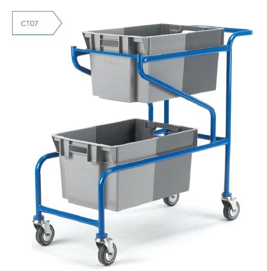 To carry 2 x 50ltr containers without lids (containers extra). Welded tubular steel construction. Overall dimensions H x L x W: 940 x 1180 x 440mm. Wheels: 4 x 125mm diameter swivel castors fitted with grey non-marking tyres. Weight: 14kg. Finish: Blue epoxy.