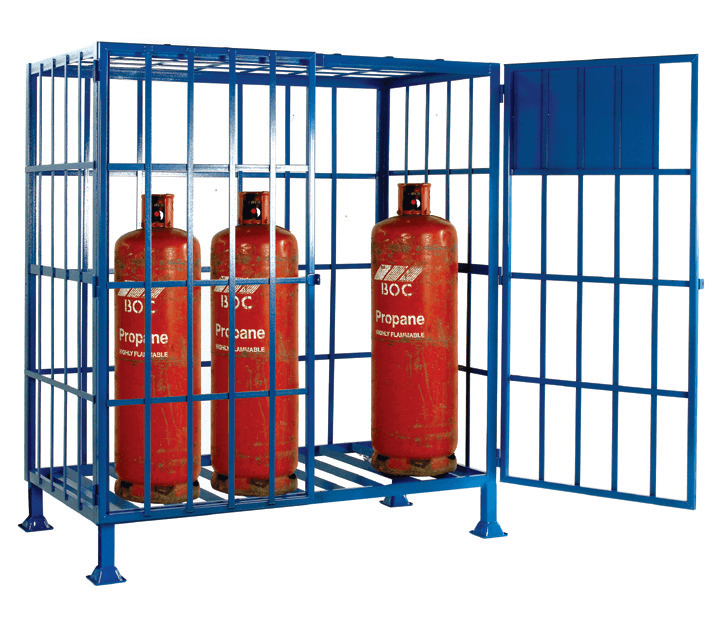 Strong and sturdy design cylinder storage security cage with hinged doors fitted with padlock facility (padlock not supplied). Doors open through 180 degrees. Manufactured from heavy duty box and angle section. Supplied complete with gas storage warning identification label.