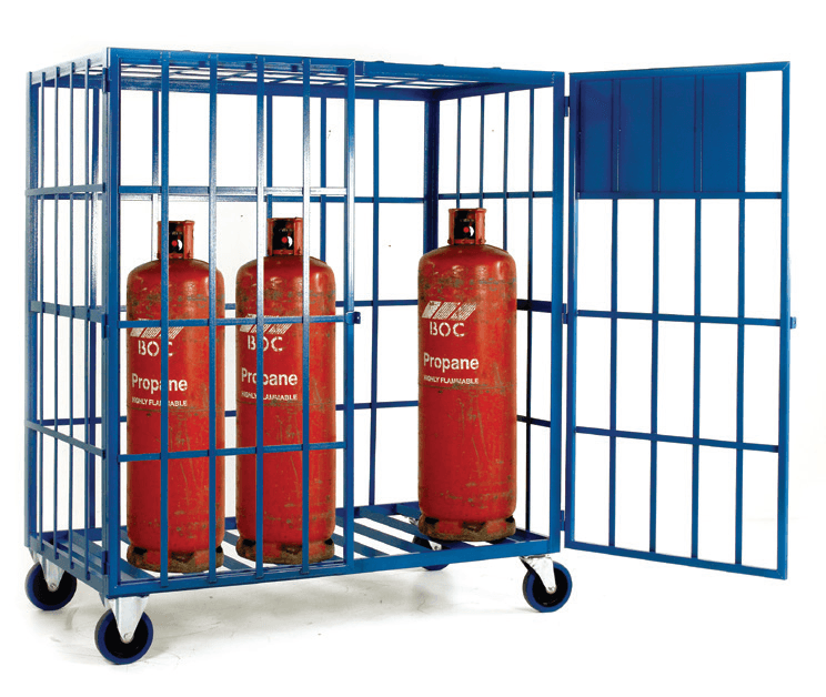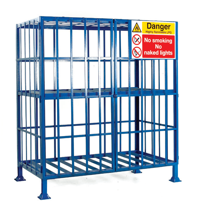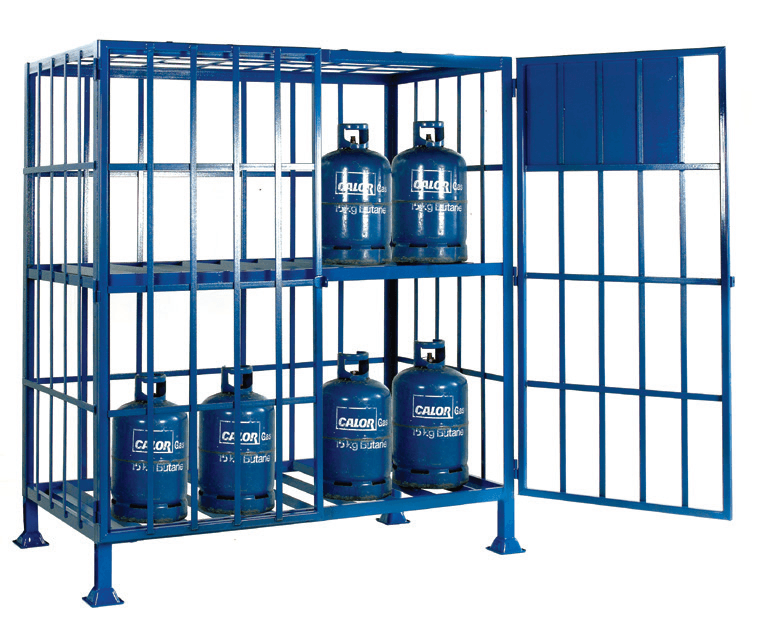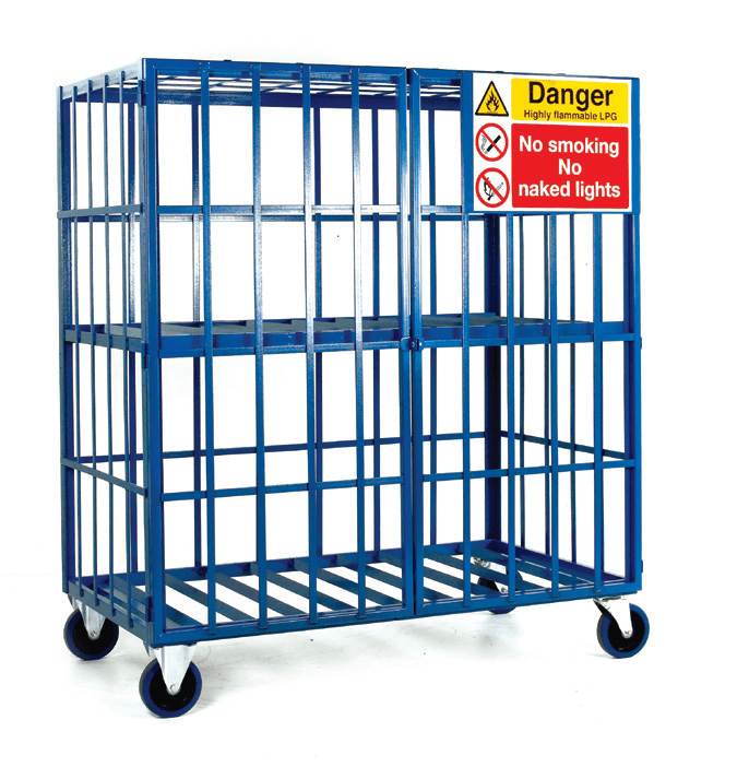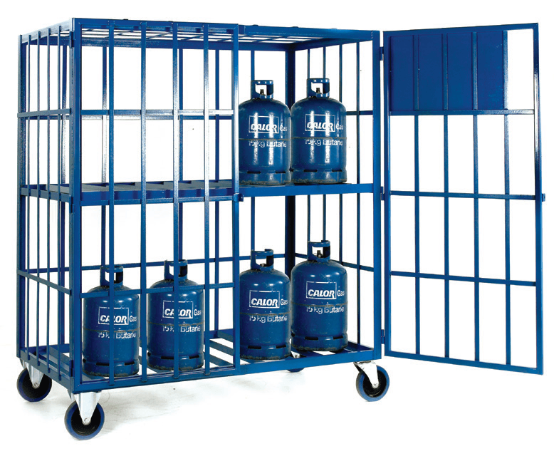 Static model mounted on 4 pallet feet. Available with or without centrally fixed shelf: Fixed shelf model to carry a maximum of 16 x calor gas type cylinders (max 380mm diameter x 650mm tall). Open shelf model to carry a maximum of 8 x propane type cylinders (max 380mm diameter x mm x 1690mm tall).