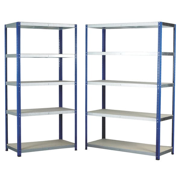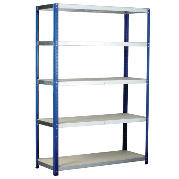 Eco Rax is a robust boltless heavy duty hand loaded shelving system consisting of powder coated blue uprights, galvanised frame beams and ties, chipboard shelves and black plastic feet.