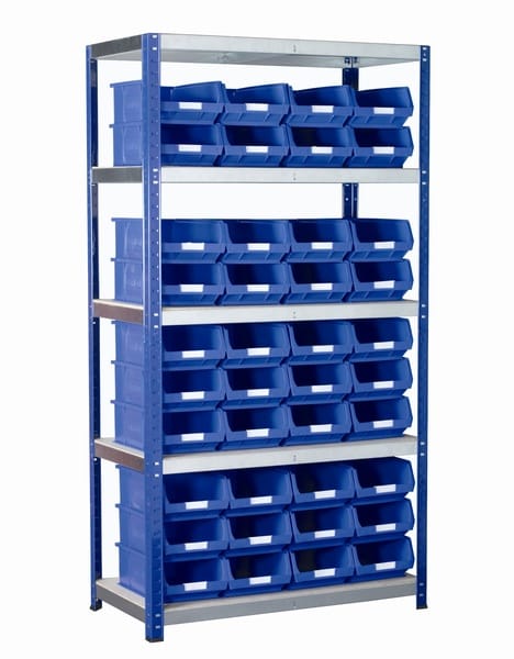 Eco-Rax is a robust boltless heavy-duty hand loaded shelving system consisting of powder coated blue uprights, galvanised frame beams and ties, chipboard shelves and black plastic feet.