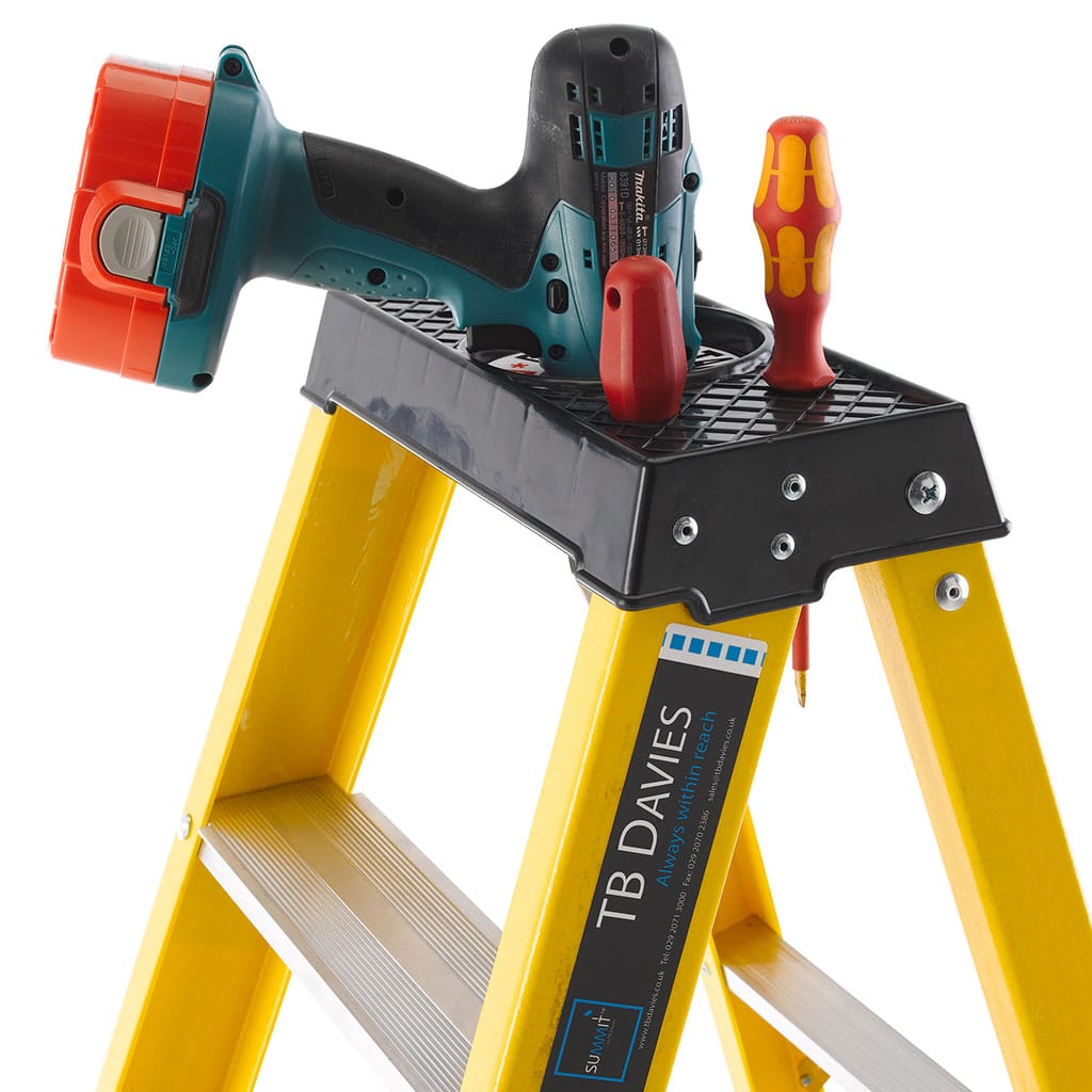 Our fibreglass stepladder range incorporates a multi-functional tool tray with non-conductive stiles, making them ideal for working around electricity. The combination of super-strong C-section fibreglass stiles and reinforced aluminium treads gives you a durable yet lightweight and easy to handle step that is perfect for the busy tradesman.
