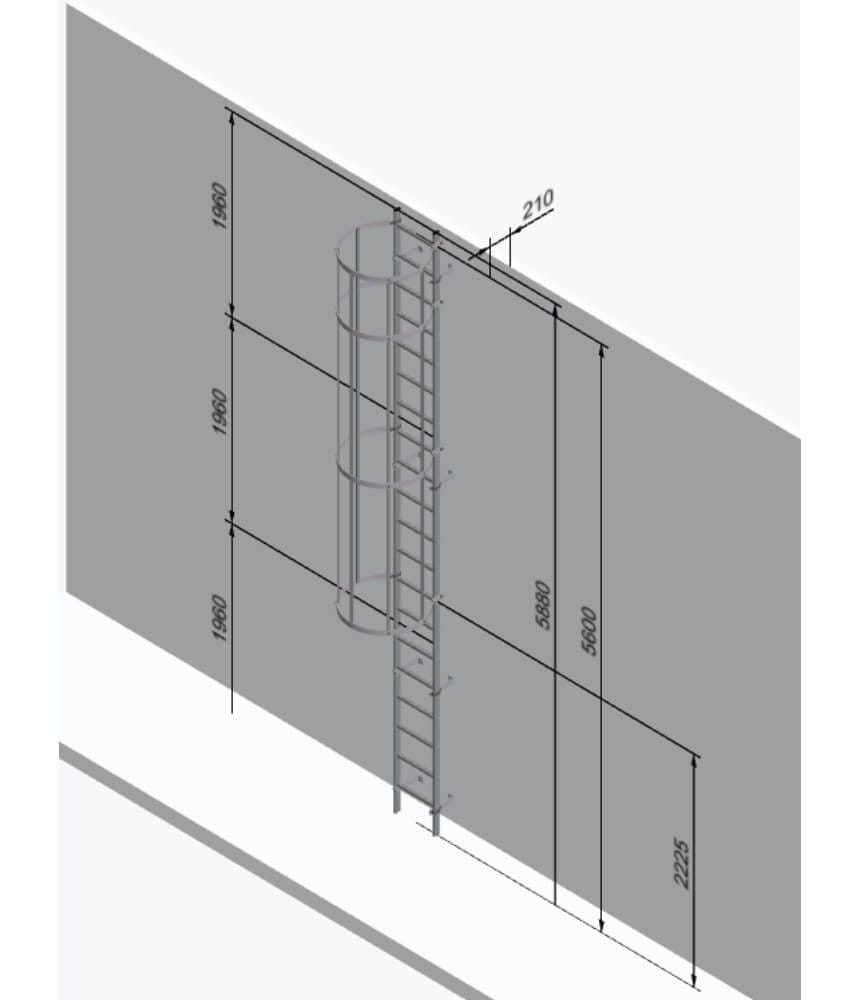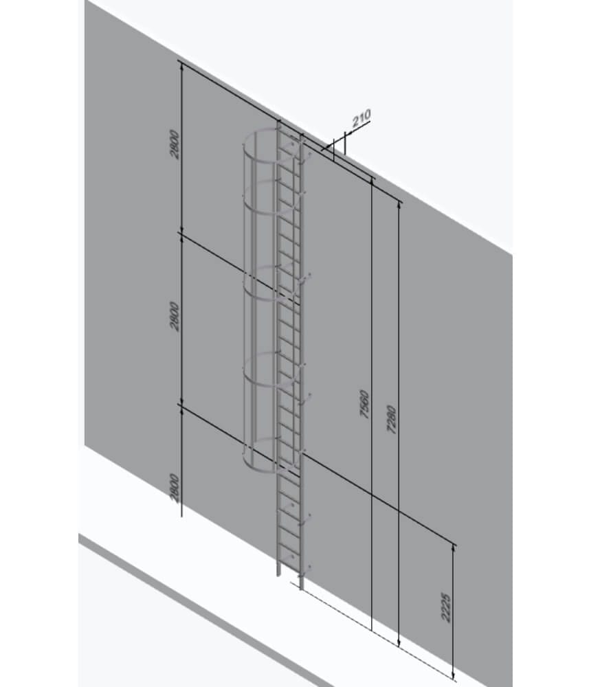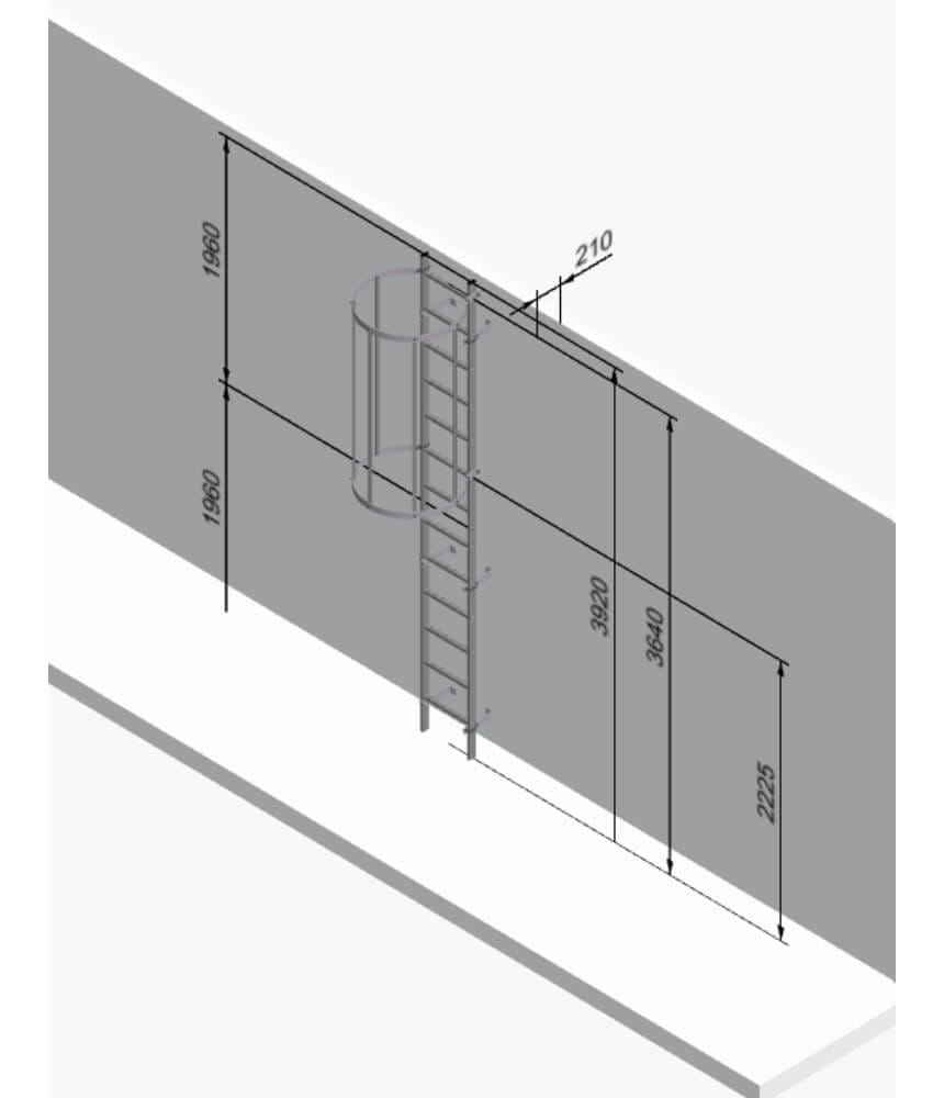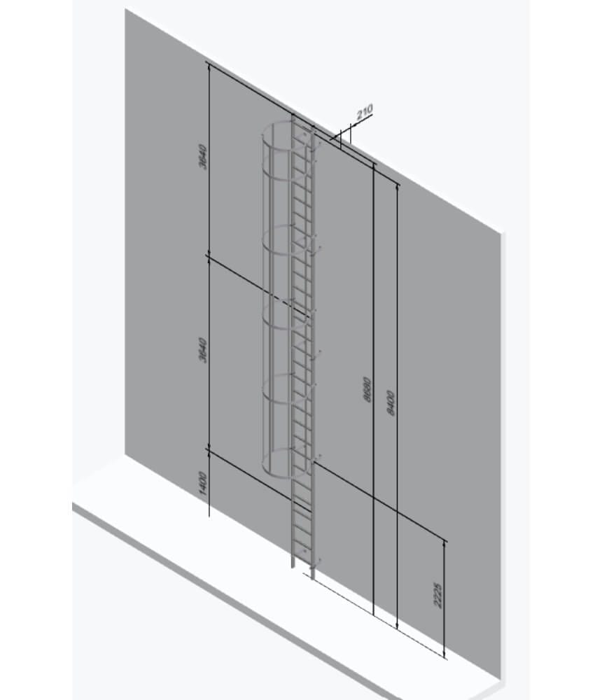 Typical 3640mm kit contains – 3 x U shaped wall brackets, 2 x safety cage hoops, 3 x safety cage braces 1450mms, 1 x 3640mm ladder section, 1 x Pair diagonal braces