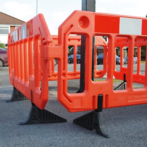 Manufactured in HDPE material which is UV resistant, and is coloured bright orange with red/white reflective panels which makes them highly visible in day or night conditions. The Barriers can be connected to each other by a ‘hook and eye’ system, which makes them very adaptable for use on uneven ground.
