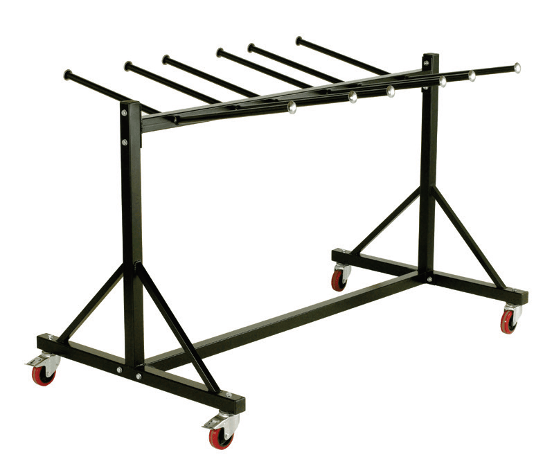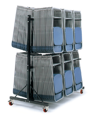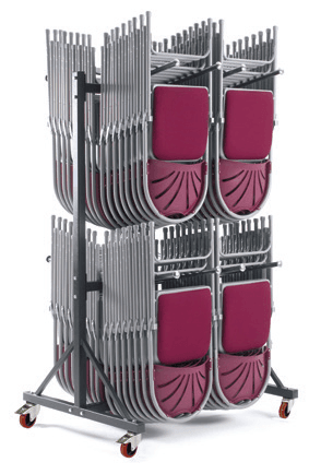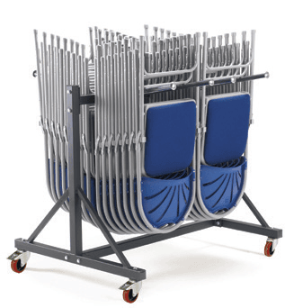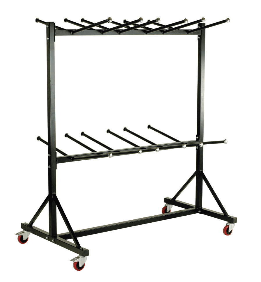 Designed for the storage and manoeuvrability of folded chairs in large quantities. Heavy duty design manufactured from box section and tube. Tubular hanging rails are covered with protective plastic sheaths and end caps.