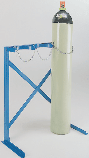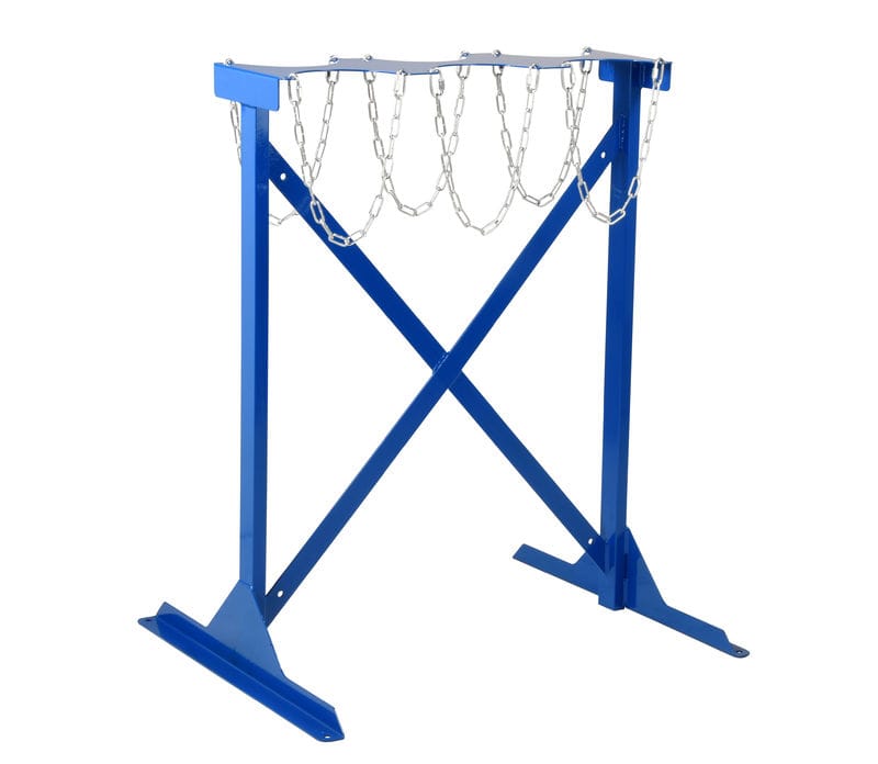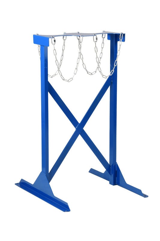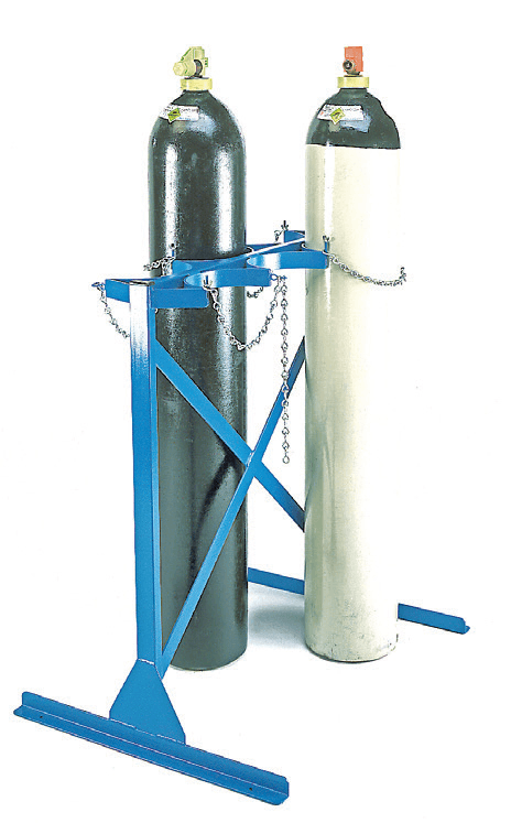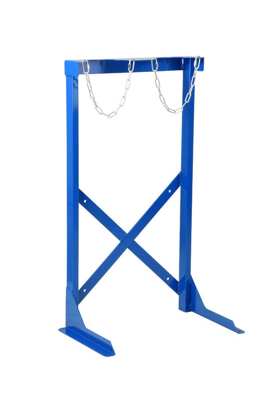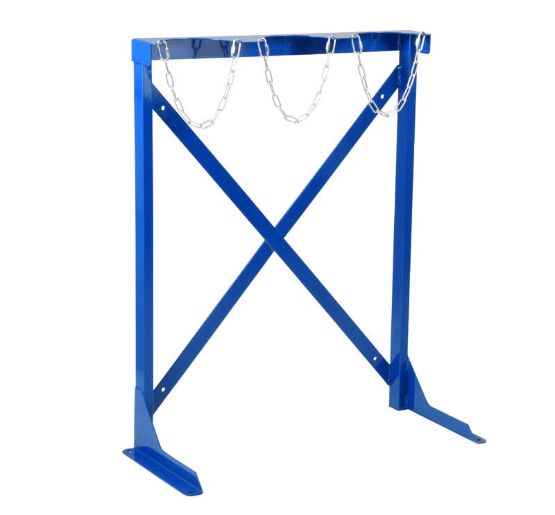 Single and double sided cylinder racks. Single sided units have rear frames pre-drilled. We strongly recommend that single sided units are fixed to the wall. Fully welded construction throughout. Steel link retention chains fitted. Finish: Blue epoxy. Overall height: 1000mm.