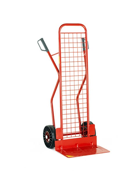 A heavy duty sack truck designed with a high back and skids.