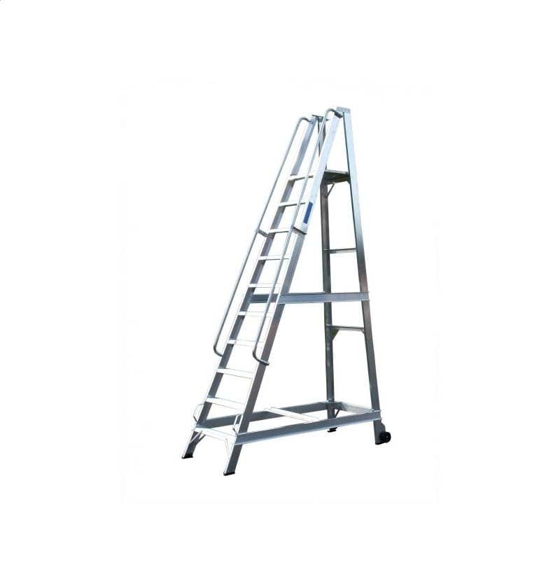 The steps are designed with a robust back support and additional bracing to give rigidity to the unit when in use. Side handrails and rear wheels are also included for safety and ease of use for the operator.