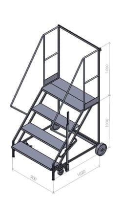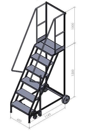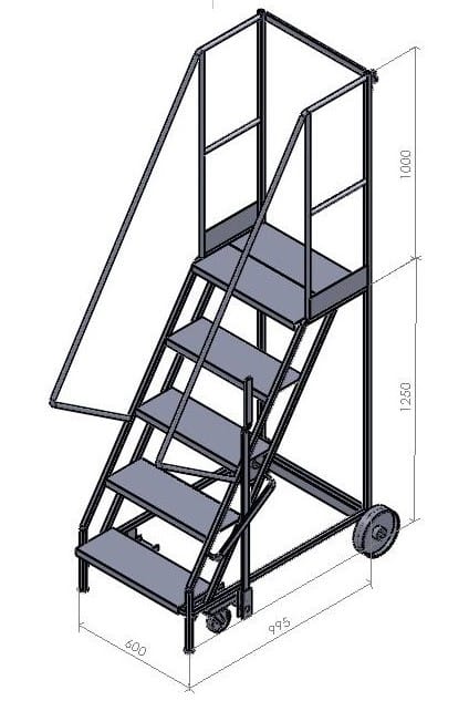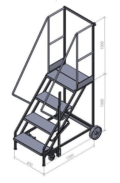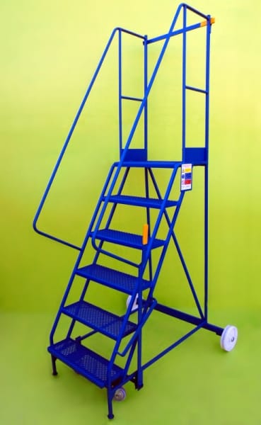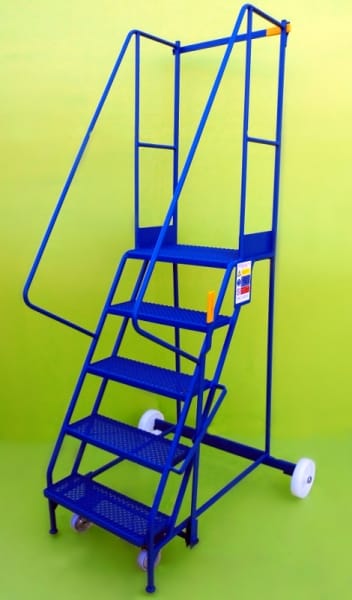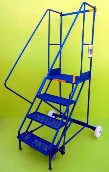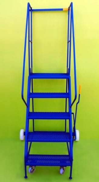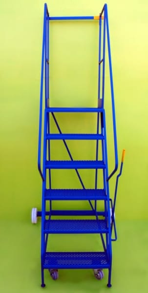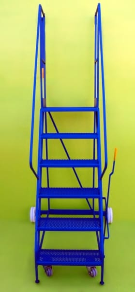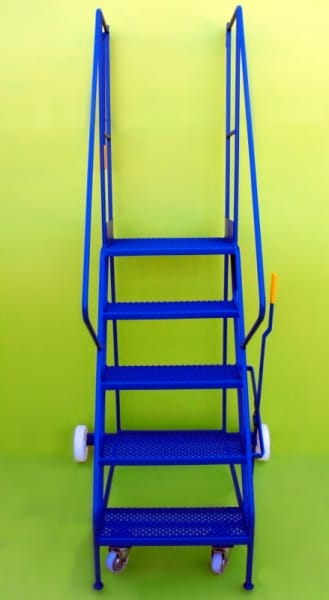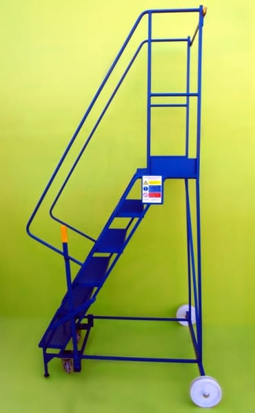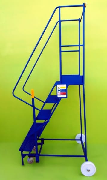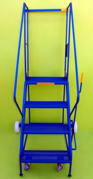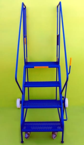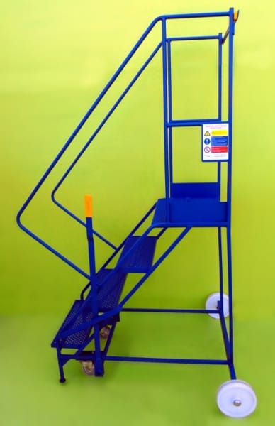 These steps are a mobile walk through access ladder. Available in 3 heights and are fitted with 2 substantial 200mm nylon wheels and 2 smaller 100mm diameter wheels housed in swivel castors allowing easy movement. On the side is mounted a brake lever which disengages the smaller wheels when in use allowing a safe stable platform. Also fitted is a safety rail at the top and safety notice on the side.