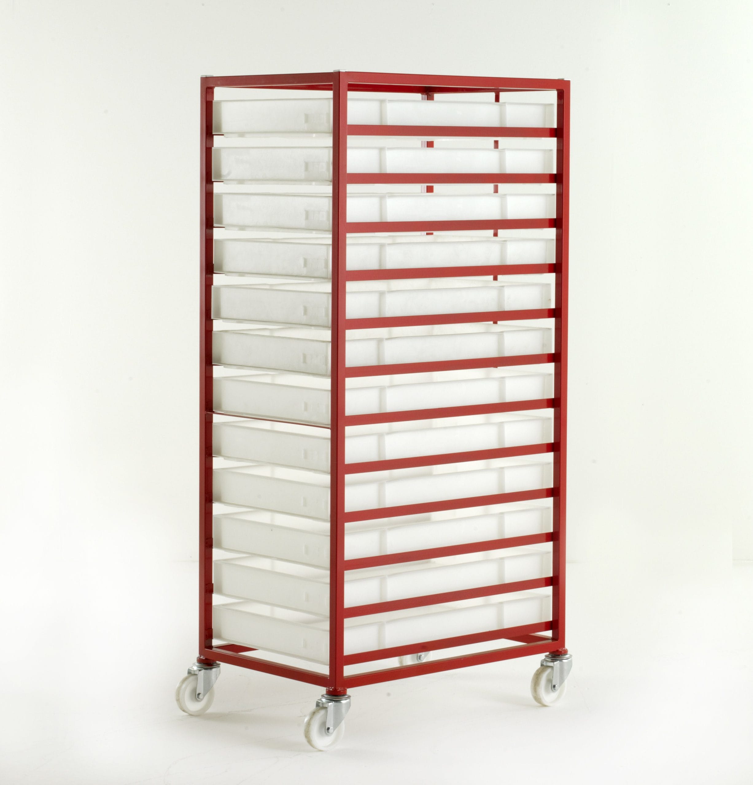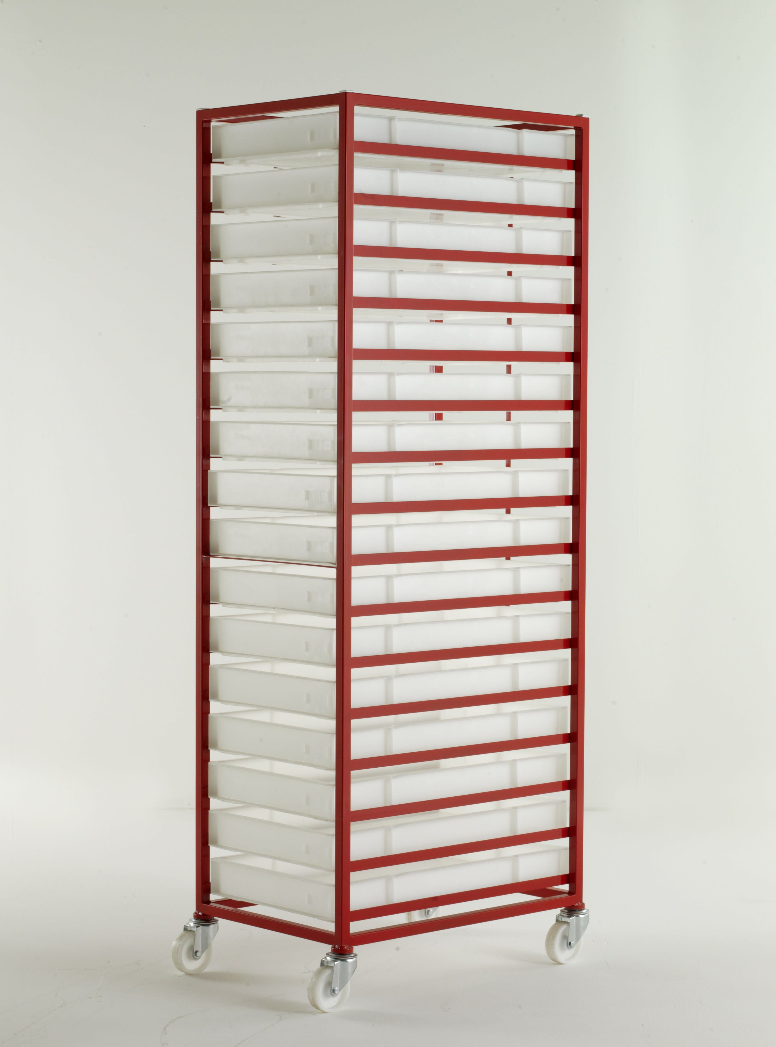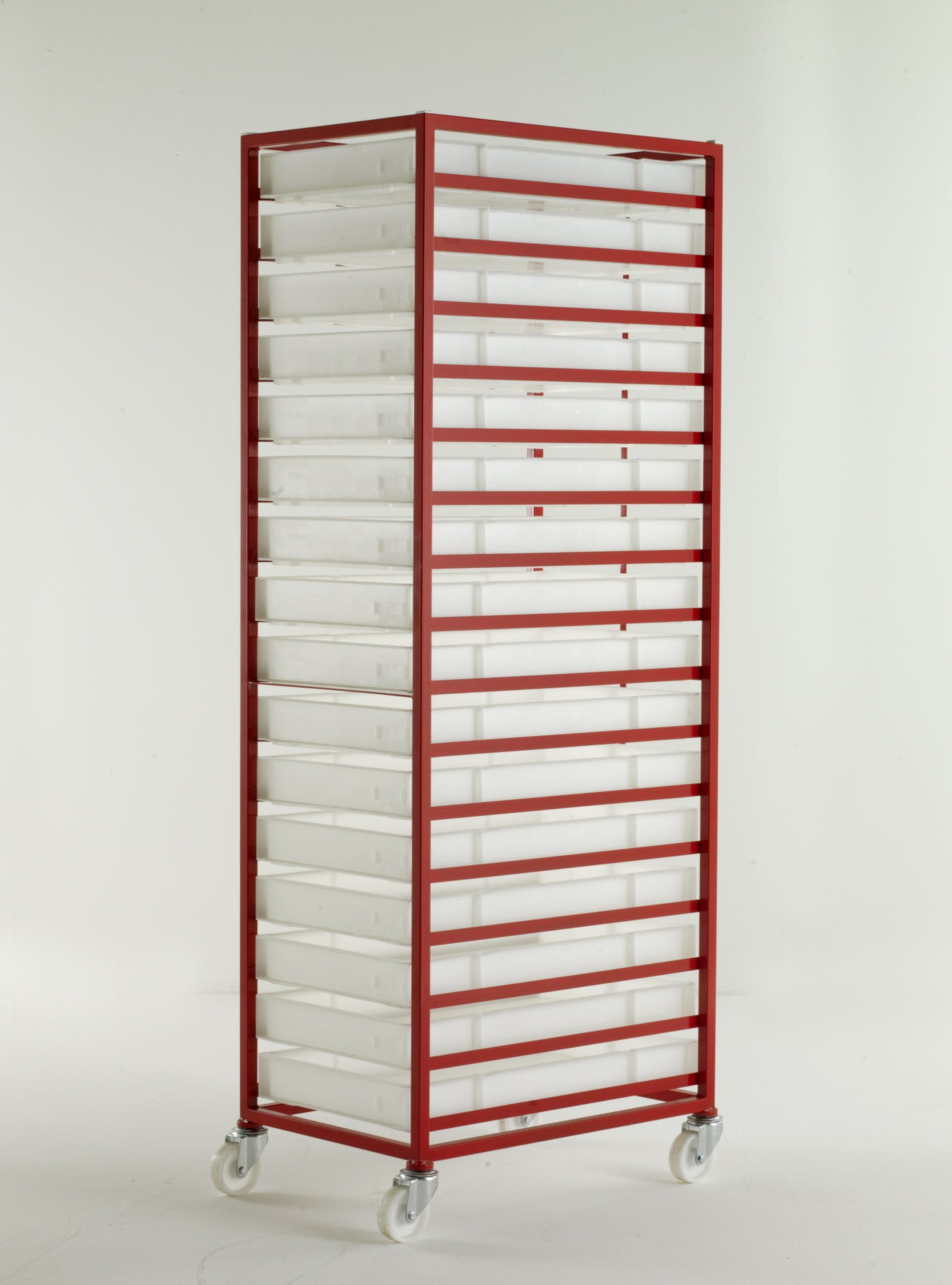Supplied with white non-toxic polyethylene food grade trays. All welded angle construction. Plastic trays slide onto fixed metal tray supports. Metal strap prevents trays being pushed through when loading. Optional steel top cover. Wheels: 4 swivel castors, white nylon 100mm diameter wheels Finish: Red epoxy. Tray specification: All round grip. Solid base and sides External H x W x L: 80 x 450 x 754mm Internal H x W x L: 68 x 412 x 717mm Thermal resistance: -30oC to 60oC, washable up to 110oC