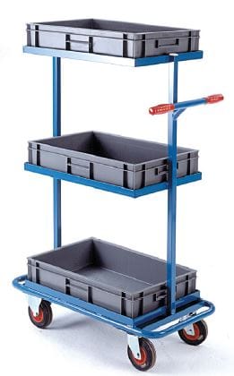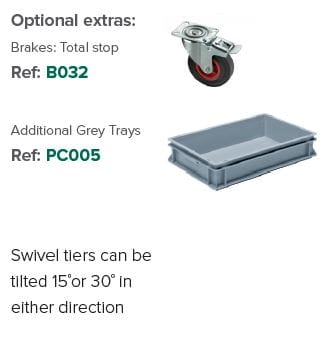 Wheels: 2 fixed and swivel castors with 125mm diameter rubber tyred wheels, roller bearings.