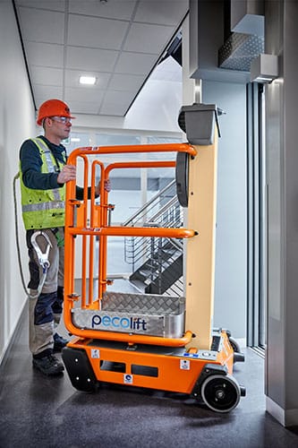 Pecolift converts 10% human energy into 100% of the power required to elevate to full working height, in just 11 seconds. For your safety the unit is autobraked on elevation and you are fully guarded from the ground up.