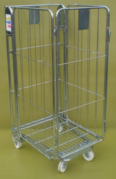 A mobile roll pallet for the safe and secure transportation of a wide range of goods built upon a strongly constructed ‘A’ frame chassis which is a nesting design saving warehouse space. This nesting A frame range of roll cages encompasses all types and styles. The sides are rod infill offering a coarse mesh to retain products. To nest when not in use, the steel deck folds up and the sides then fold in. The cages are then nested into the back of each other, inline nesting like a shopping trolley. Nested space saving is 3:1 floor space saving. The roll pallet as standard has a single load bearing deck.