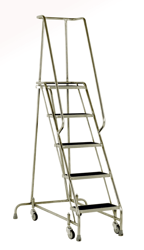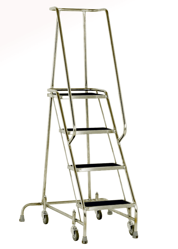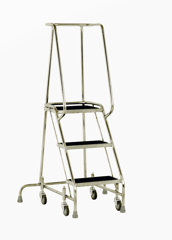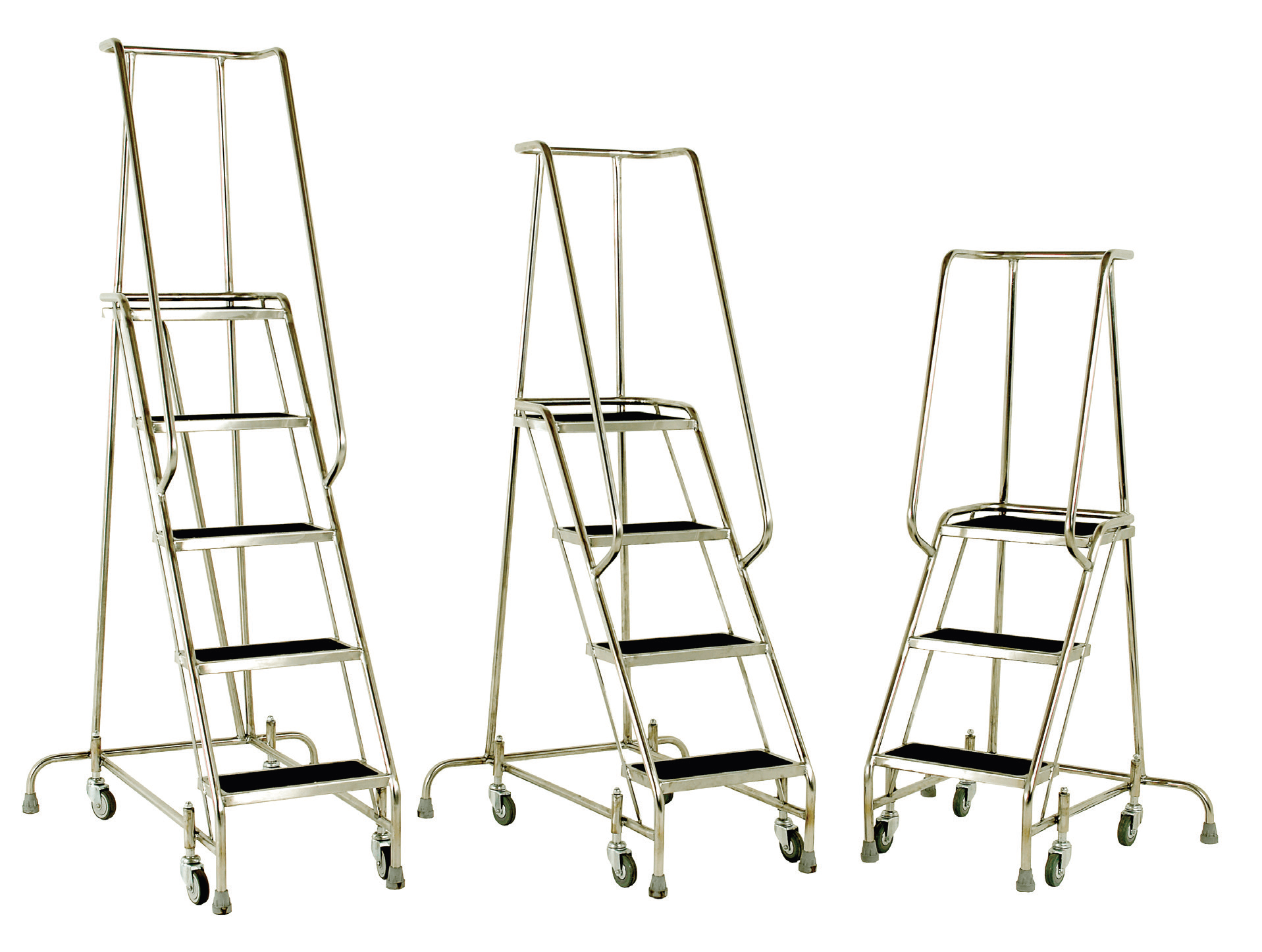 - Stainless steel mobile step units with close fitting handrail round three sides of platform.