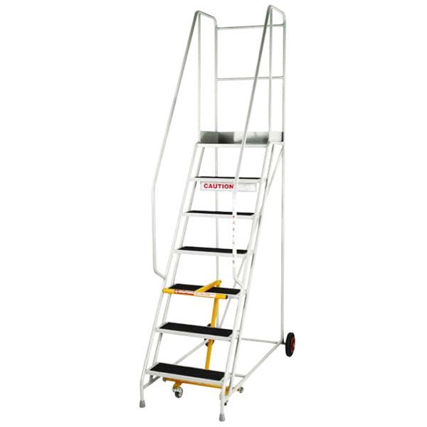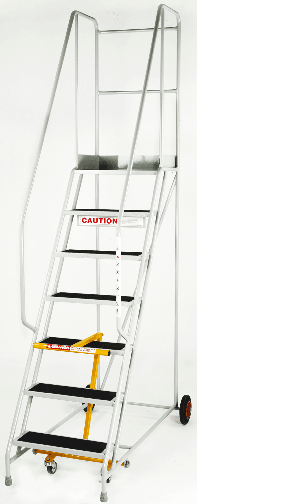 Welded tubular construction, fitted with anti-ascent pull through bar which locks in mobile position onto tread via hook mechanism. Moves fully through tread when in static postion allowing castors to retract. Grey non-marking feet to front legs. Mounted on 2 x 200mm