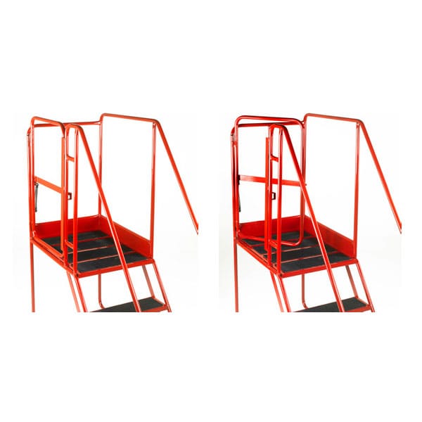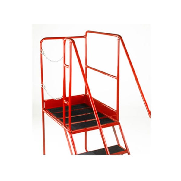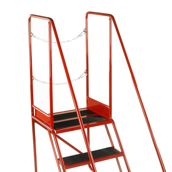 Construction: Welded heavy gauge steel box section and bar. Fitted with hand lock lever anchorage; when locked, the front feet rest firmly on the floor, feet fitted with protective grey non-marking rubber feet. Safety warning bar fitted to protrude in front of steps, linked to hand lock lever mechanism, to deter users from climbing steps when still in ‘mobile’ mode. Stability base model: Outboard wheels mounted on splayed base frame gives superior stability.