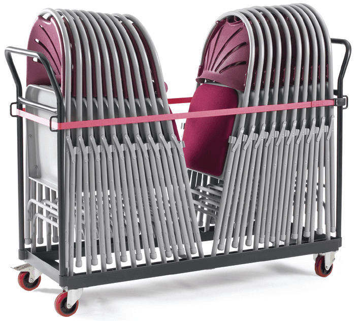 Designed to carry folded chairs of overall size (W x D x H) 470 x 540 x 870mm in the vertical position. Sturdy folded sheet steel and tubular design. Supplied with handles removed and with easy to assemble instuctions, complete with retaining strap.