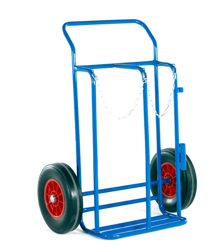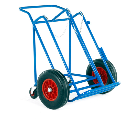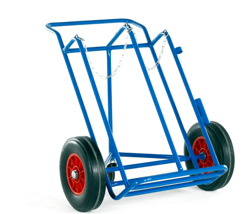 Trolleys to transport 1 Oxygen cylinder and 1 Acetylene cylinder with rods and cable holders. Steel link retaining chains fitted.