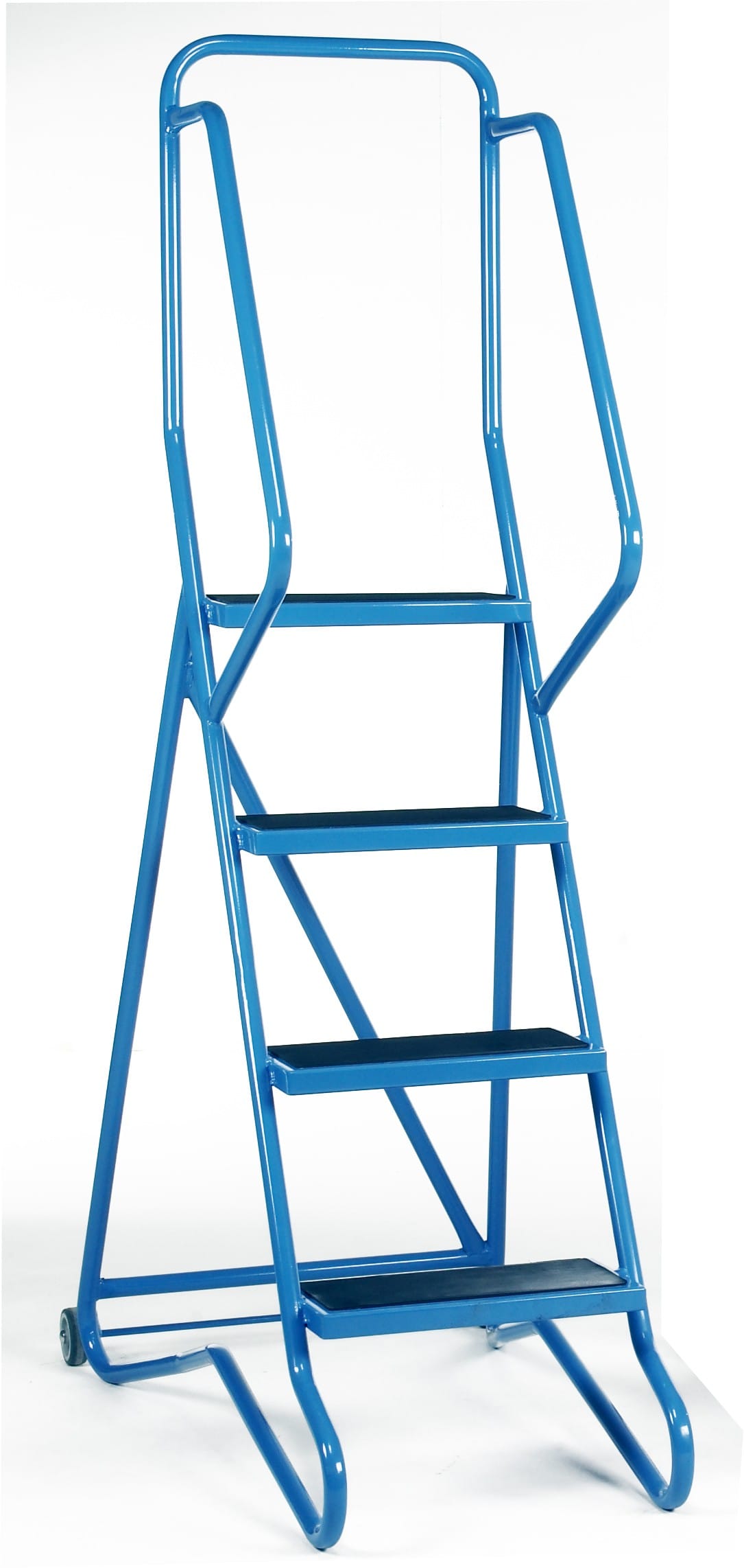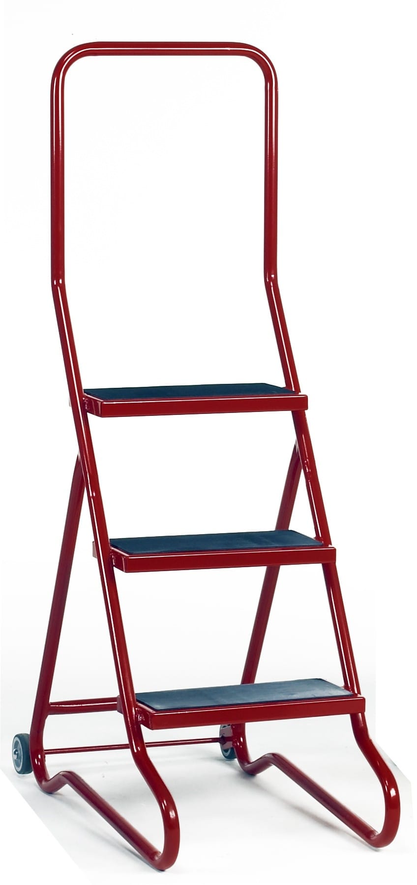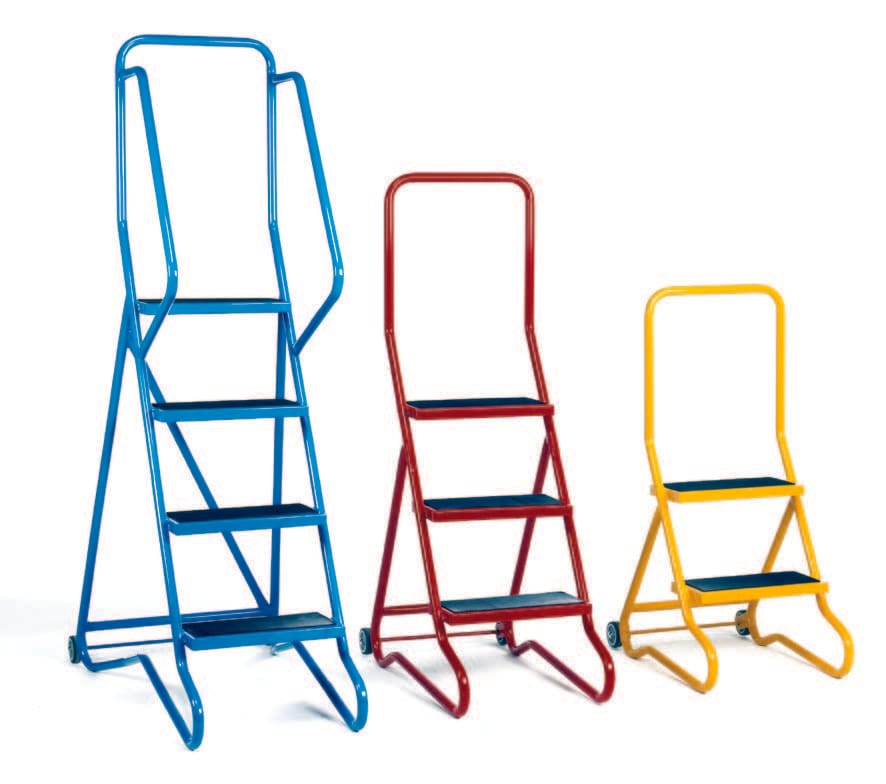 Static steps which are fitted with 2 x 75mm diameter wheels to the rear frame. When steps are tilted, wheels allow easy movement to next location. Powder coated finish Fitted with 75mm wheels with grey non marking rubber tyres.